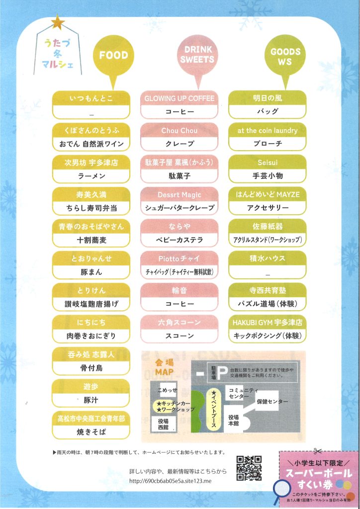 宇多津商工会青年部が、あったかグルメとワークショップ、家族でのんびり楽しめる「うたづ冬マルシェ」を開催します!